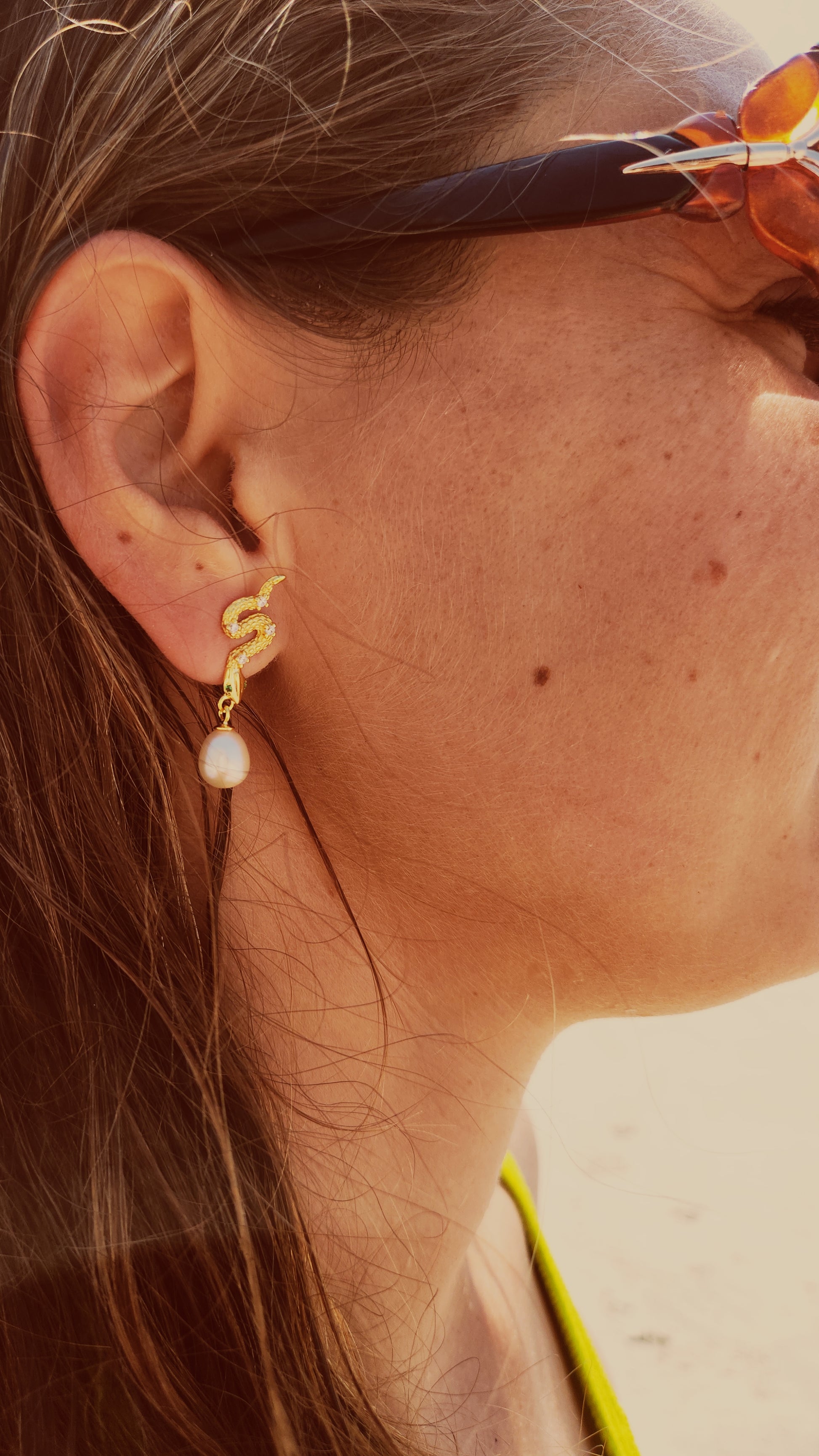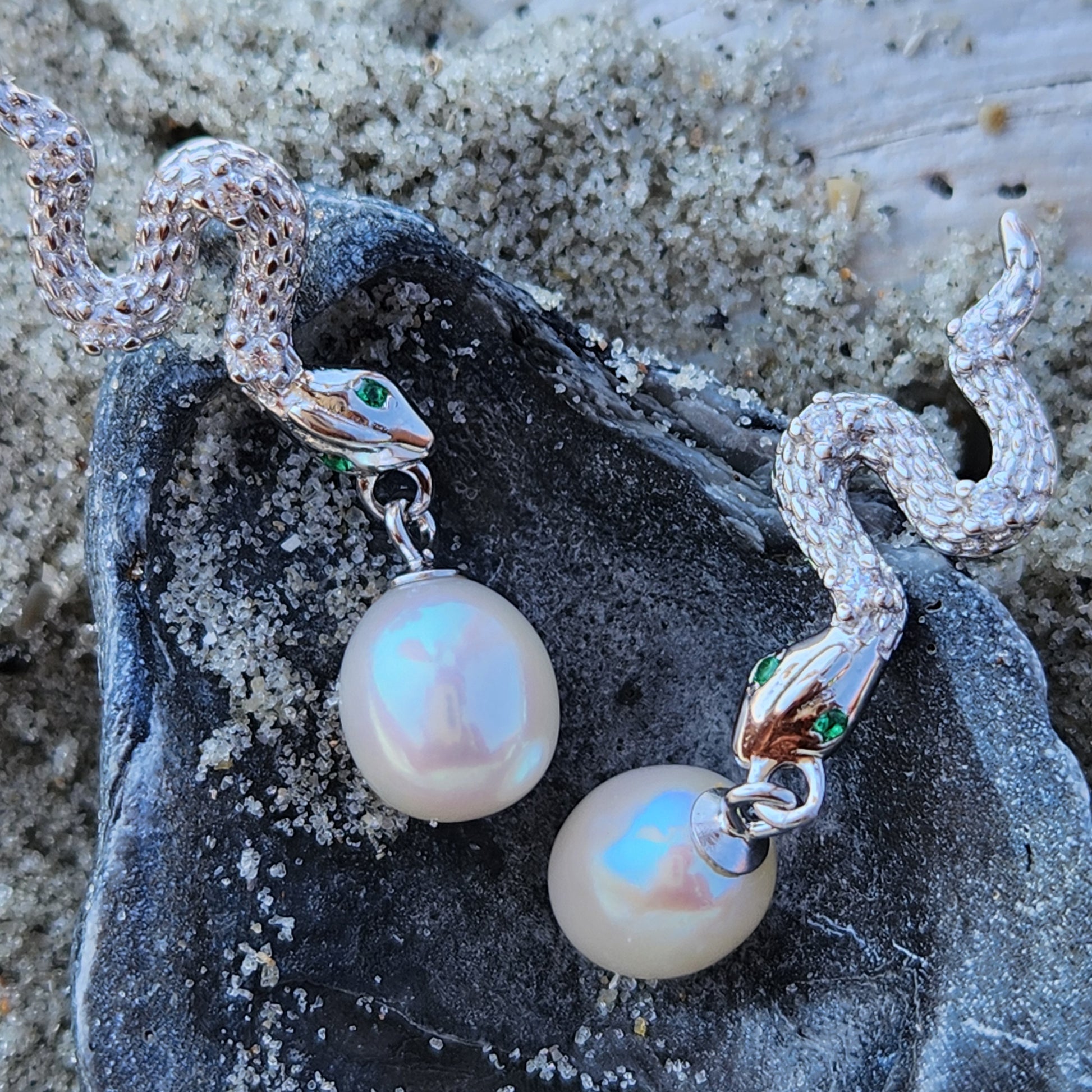 Add some bite to your wardrobe with our COILED SERPENT EARRINGS. These sterling silver 925 earrings feature a sleek snake design, accented with shimmering cubic zirconia and a lustrous fresh water pearl. Make a statement everywhere you go with these unique and stylish earrings.